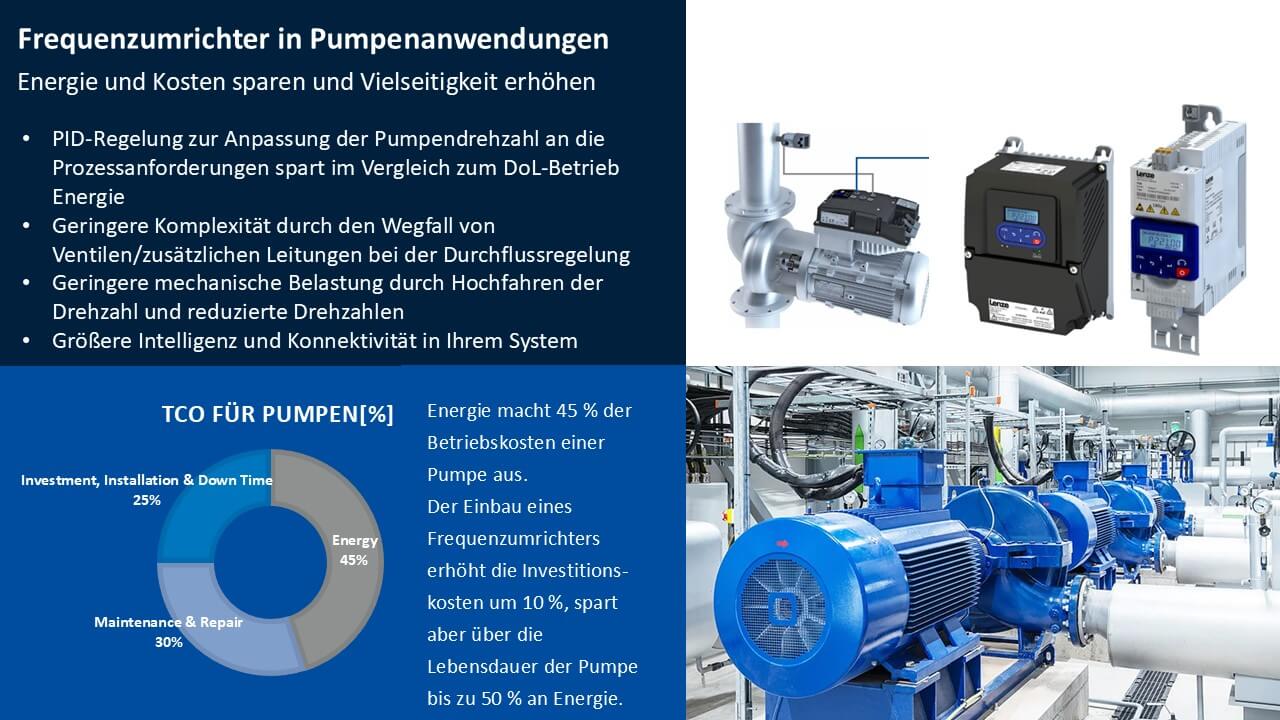 Frequenzumrichter spielen eine zentrale Rolle bei der Verbesserung von Pumpensystemen, indem sie die Motordrehzahl an den Bedarf anpassen. Dies kann zu Energieeinsparungen von bis zu 50 % führen. Das Bewusstsein und die zunehmenden Effizienzstandards, dass Pumpen nicht mehr ungeregelt mit veralteten Motoren angetrieben werden sollten, nimmt heutzutage immer mehr zu. Dies führt häufig zum Umstieg auf moderne Hocheffizienzmotoren der Klasse IE4+ und macht den Einsatz von Frequenzumrichtern erforderlich, was die Energieeffizienz weiter steigert. Durch die Optimierung der Motorleistung senken Frequenzumrichter nicht nur den Energieverbrauch, sondern verlängern auch die Lebensdauer von Pumpensystemen und tragen so zu niedrigeren Betriebskosten und verbesserter Nachhaltigkeit bei.