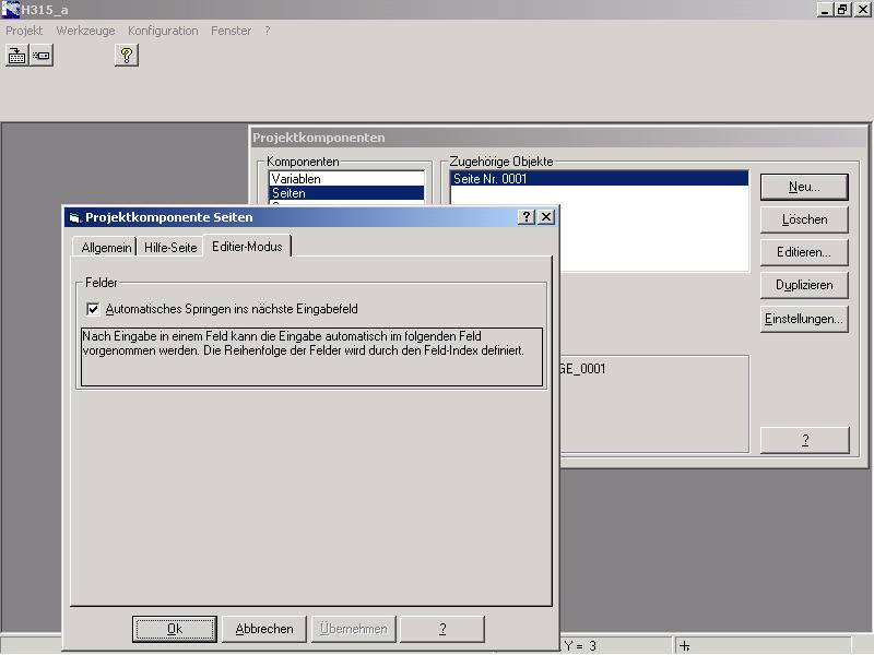 Beim Anlegen einer neuen Seite bzw. nach der Auswahl einer Seite und Betätigung des Button <Einstellungen> öffnet sich das Fenster Projektkomponenten Seiten. Um das Automatische Weiterspringen zum nächsten Eingabefeld zu aktivieren, ist im Register Editier-Modus das Häckchen zu setzen.