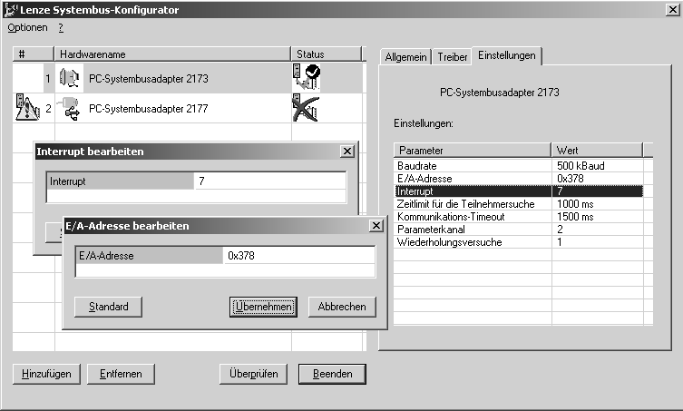 Ja, über die Lenze Software Systembus-Konfigurator kann für alle Lenze PC Programme, die eine CAN-Kommunikation nutzen (z. B. Global Drive Control GDC), der Interrupt für die CAN-Kommunikation über den Parallelport (LPT1) mittels PC-Systembusadapter EMF 2173IB geändert werden. Es müssen dazu die Interrupt-Nr. und die zugehörige E/A-Adresse bekannt sein. Diese Informationen erhalten sie aus dem Gerätemanager ihres Windows Betriebsystems.