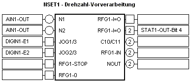 Beispiel: Die Funktionen NSET1-RFG1-STOP (Rampengenerator anhalten) und NSET1-RFG1-0 (Rampengenerator an Rampe auf 0 fahren) werden nicht angesteuert. In der Funktionsblockdarstellung im GDC sind beide Eingänge ohne Benennung dargestellt.