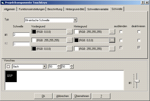 Im HMI Designer können Beschriftungsfelder (Textfelder) nicht in Abhängigkeit von einer Variablen ihre Darstellung (z.B. inverse Darstellung) ändern. Um trotzdem diese Funktion zu realisieren, ist anstelle des entsprechenden Beschriftungsfeldes ein Touchkey einzusetzen. Das Erscheinungsbild eines Touchkeys lässt sich über eine Variable, die sogenannte Schwellenvariablen verändern. Bei der Definition des Touchkeys ist wie folgt vorzugehen: