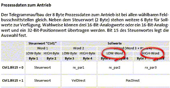 In der übergeordneten Steuerung, z. B. einer S7, müssen Low- und High-Word also in entsprechend vertauschter Reihenfolge auf das Prozessdatum geschrieben werden, damit der richtige Wert im Antriebsregler ankommt.