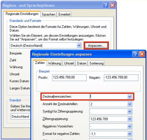 Die Ursache kann darin liegen, dass bei Windows unter Systemsteuerung / Regions- und Sprachoptionen in der Vorwahl der Dezimaltrennzeichen kein Komma eingestellt ist. Tragen Sie als Dezimaltrennzeichen ein Komma ein (siehe Bild unten).