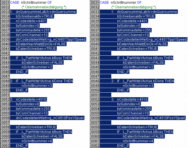 Oft ist es notwendig, dass mehrere Zeilen in einem ST-Programm gleichmäßig eingerückt werden müssen, z. B. bei Einfügen von weiteren IF-Anweisungen, Einrücken von CASE-Fällen etc. Gehen Sie wie folgt vor: