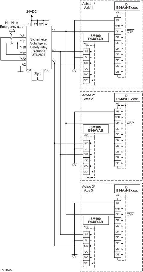9400 mit SM100 - Sicherer Stopp 1 an drei Antriebsreglern mit elektromechanischem Sicherheits-Schaltgerät - Performance Level d