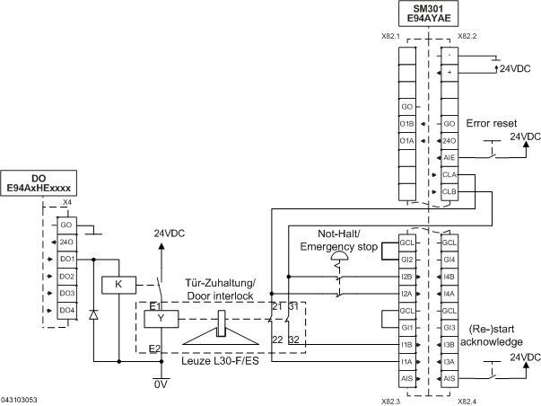 Es ist möglich, mit einem nicht-sicheren Ausgang des Grundgerätes die Zuhaltung einer Schutztür zu öffnen, und den Status dann vom Sicherheitsmodul auswerten zu lassen. So kann der sichere Ausgang des SM301 für weitere Funktionen genutzt werden.
