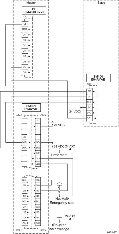 Sobald am Master STO aktiviert wird, wird das SM100 des Slaves abgeschaltet.