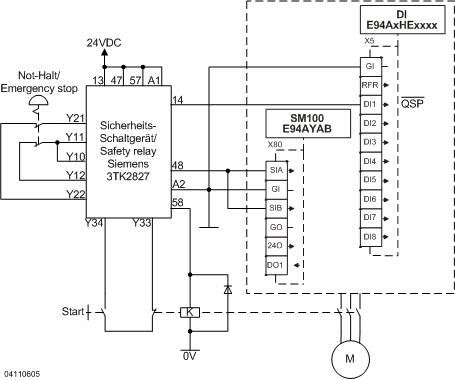 9400 mit SM100 - Sicherer Stopp 1 mit elektromechanischem Sicherheits-Schaltgerät und Motorschütz - Performance Level d