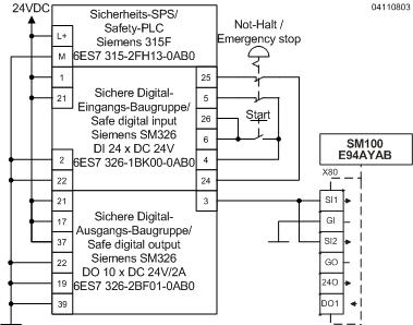 Funktion: Der Motor wird bei Anforderung der Sicherheitsfunktion nach Stopp-Kategorie 0 der EN 60204-1 abgeschaltet. Da das SM100 keinen Beitrag zur gefährlichen Versagenswahrscheinlichkeit PFD und gefährlichen Versagensrate PFH liefert, ist es nicht erforderlich, die Rückführung DO1 zu verwenden. Alle sicherheitsrelevanten Fehler, die im SM100 auftreten können, münden im sicheren Zustand. Fehlerausschlüsse wurden für geschützt verlegte Leitungen gemacht (nach DIN EN ISO 13849- 2:2003-12 und IEC 61800-5-2:2007-07). Das gilt für Leitungen, die durch einen Kabelkanal geschützt, innerhalb eines Schaltschranks verlegt sind.