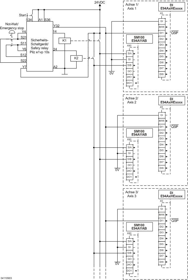 9400 mit SM100 - Sicherer Stopp 1 an 30 Antriebsreglern mit elektronischem Sicherheits-Schaltgerät - Performance Level e