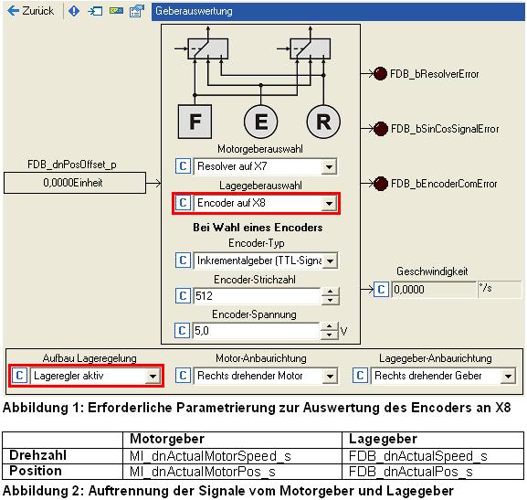 Die Einstellung C02570 = 2 (Lageregler aktiv) bedeutet in diesem Fall nicht die Aktivierung einer Lageregelung, sondern lediglich die Auftrennung der Signale vom Motorgeber und Lagegeber.