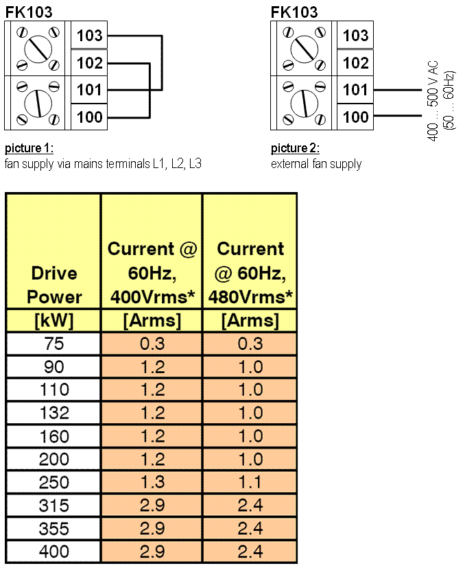 3. Schließen Sie eine Wechselspannung 400 ... 500 V AC, 50/60 Hz an die Klemmen FK103/100 und 101 an (wie in Bild 2 dargestellt). Die Stromaufnahme der Lüfter für die verschiedenen Geräte ist in der rot markierten Spalte der Anlage ersichtlich.