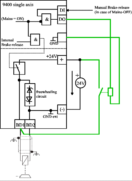 Beim integrierbaren Bremsenmodul der Servo Drives 9400 (Single Drive) ist zum Lüften der Haltebremse die Versorgung des DC-Zwischenkreises erforderlich (Mains=ON). Intern wird zur Bremsenansteuerung die Spannung vom Schaltnetzteil der Endstufen-Treiber, das über den DC-Zwischenkreis versorgt wird, benötigt.