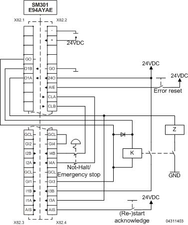 Um eine Last (Z), die in P/M-(plus/minus)-Schaltung angeschlossen ist, mit dem SM301 schalten zu können, muss ein Koppelrelais (K) verwendet werden. Es muss ein zwangsgeführtes Relais verwendet werden (z. B. Wago 788-384 oder unter www.tuvasi.com), wobei der Rückmeldekontakt auf einen sicheren Eingang des SM301 geführt werden muss, um die korrekte Funktion des Relais zu überprüfen. Dies geschieht, indem die Diskrepanzzeit zwischen dem sicheren Ausgang und dem Relais durch den sicheren Eingang SD-In3 überwacht wird. Der maximale Laststrom eines Kanals des sicheren Ausgangs beträgt 500 mA.