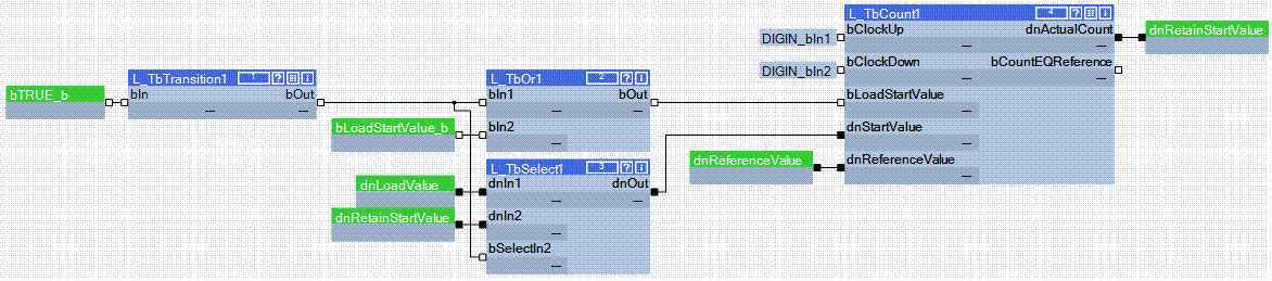 Wird das Setzen des Zählers auf einen Startwert auch anwenderseitig benötigt, kann die FB-Verschaltung wie folgt erweitert werden (Das Laden des Zählers von Seiten des Anwenders erfolgt in diesem Beispiel über die Variablen bLoadStartValue_b und dnLoadValue):