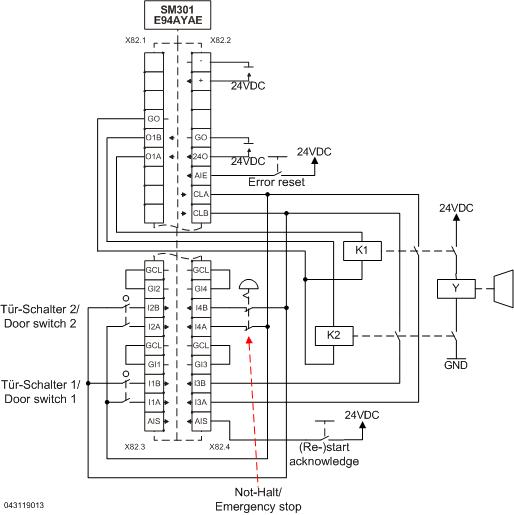 Um eine zweikanalige Bremsenansteuerung mit dem SM301 zu realisieren, müssen zwei Koppelrelais verwendet werden. Es müssen zwangsgeführte Relais verwendet werden (z. B. Wago 788-384 oder unter www.tuvasi.com), wobei der Rückmeldekontakt auf einen sicheren Eingang des SM301 geführt werden muss, um die korrekte Funktion der Relais zu überprüfen. Dies geschieht, indem die Diskrepanzzeit der beiden Relais über den sicheren Eingang überwacht wird.