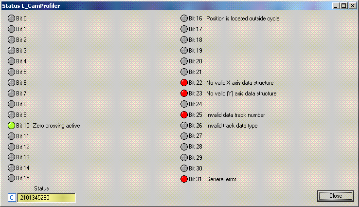 Ein Wechsel der Positionsregelung über Codestelle C2570 (Aufbau Lageregelung) stellt intern unter Umständen die wirksamen Getriebefaktoren im Achsmaßsystem um. Unter C2570 = 1 (Winkelregler aktiv) gelten stets die Getriebefaktoren wie in den Codestellen C2520 und C2521 eingestellt, unter C2570 = 2 (Lageregler aktiv FW<5.0) oder C2570 = 3 (Lageregler aktiv) und Wahl eines externen Lagerückführsystems gelten die Getriebefaktoren wie in C2522 und C2523. Da bei einer Änderung des effektiven Getriebefaktors die inkrementelle Wertetabelle der Kurvendaten nicht mehr mit der physikalischen Maschinenanordnung übereinstimmt, werden die inkrementellen Kurvendaten als ungültig markiert und es kommt zur Ausgabe einer Fehlermeldung über den Ausgang L_CamProfiler.bError = TRUE.