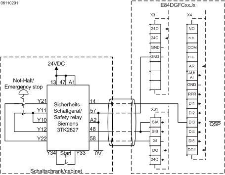 Für die Leitung zwischen Schaltschrank und 8400 motec muss bei diesem Beispiel ein mechanischer Fehlerausschluss gemacht werden, da Querschlüsse sicherheitskritisch wären.