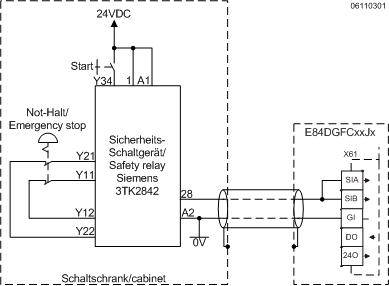 Annahme: Für die Leitung zwischen Schaltschrank und 8400 motec kann bei diesem Beispiel kein mechanischer Fehlerausschluss gemacht werden. Querschlüsse, die hier auftreten können, münden im sicheren Zustand.