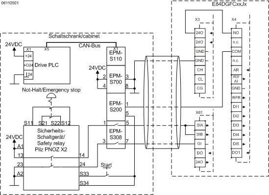 8400 motec mit SO10 - Sicher abgeschaltetes Moment mit elektromechanischem Sicherheits-Schaltgerät (PM-schaltend) - kein Fehlerausschluss auf der Leitung - Performance Level e