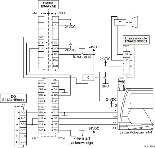 Um eine sichere, einkanalige Bremsenansteuerung mit dem SM301 zu realisieren, muss ein Koppelrelais verwendet werden. Es muss ein zwangsgeführtes Relais verwendet werden (z.B. Wago 788-384, wobei der Rückmeldekontakt auf einen sicheren Eingang des SM301 geführt werden muss, um die korrekte Funktion des Relais zu überprüfen. Dies geschieht, indem die Ansteuerung und die Rückmeldung durch die Diskrepanzüberwachung des sicheren Eingangs I4 überwacht werden.