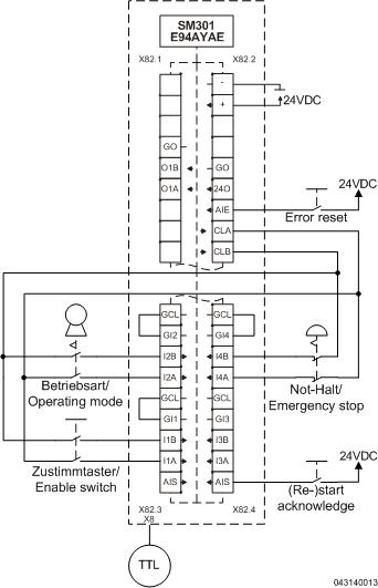 Wird im Sonderbetrieb der Zustimmtaster betätigt, wird sicher abgeschaltetes Moment aufgehoben und der Motor kann über das elektronische Handrad (TTL-Geber an X8) manuell mit sicher begrenzter Geschwindigkeit verfahren werden.