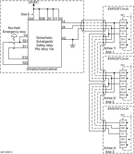 Wenn für die Leitungen zwischen dem Sicherheits-Schaltgerät und den Antriebsreglern ein Fehlerausschluss angenommen werden kann, ist es auch möglich, die Kapazitäten durch Reihenschaltungen mit Dioden an den sicheren Ausgängen 14 und 24 von den OSSD-Ausgängen zu entkoppeln.