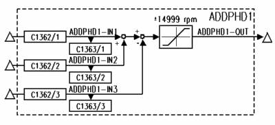 Der Funktionsblock ADDPHD1 (9 µs) verliert keine Inkremente, auch wenn die Ausgangsbegrenzung ±14999 rpm anspricht (Nachlaufspeicher). Dieser Nachlaufspeicher ist gerade in der Kurventechnik von besonderer Wichtigkeit, da die Drehzahl integriert wieder eine Position (Winkel) ergibt.