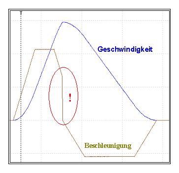 Profilformen, bei denen keine Konstantfahrt-Phase erreicht wird, führen zu Beschleunigungssprüngen, wie es bei linearen Geschwindigkeitsverläufen vorkommt. Die Profilform folgt nach dem Erreichen der maximal möglichen Geschwindigkeit dann nicht mehr dem geforderten ruckbegrenzten Verlauf.