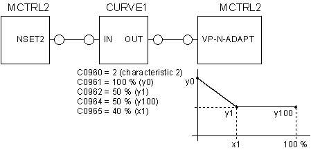 Über den Eingang MCTRL-VP-N-ADAPT soll mittels des Funktionsblocks CURVE1 die Proportionalverstärkung VPN (C0070) drehzahlabhängig anpassen werden. Im nachfolgenden Beispiel wird bei zunehmender Drehzahl die Verstärkung auf 50 % von C0070 halbiert. Erfahrungsgemäß ist eine Erhöhung der Proportionalverstärkung auch im Feldstellbereich empfehlenswert; hierzu kann die gleiche Verschaltung durch Anpassung der Kennlinie im CURVE1 (z.B. C0960 = 3) verwendet werden.