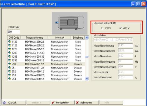 230 V-Motoren in GDC: In der Motorenliste in GDC (in der folgenden Abbildung dargestellt) ist eine Auswahl von Motoren bei 230 V-Betrieb über C0086-Code bislang nicht möglich. Motordaten müssen bei 230 V-Betrieb manuell eingegeben werden. Ein Hinweis, dass eine manuelle Eingabe stattfinden muss bzw. die Einstellungen für 400 V / 87 Hz-Betrieb gelten, ist nicht vorhanden. Als Funktionserweiterung wurde ein Auswahl-Button 400 V / 230 V implementiert. Er ermöglicht nach Wahl C0086-Codes die Wahl der Betriebsart und somit automatische Einstellung der korrekten Motordaten.
