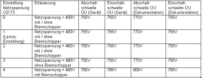 Aufgrund generatorischer Energie steigt die Spannung im Zwischenkreis an. Da die Abschaltschwelle OU bei C0173 = 0; 1; 2 bzw. 3 mit 755 V relativ dicht an der Bremschopperschwelle (Gerät 935x) von 725 V (bei Einstellung 400 V-Netz) liegt, kann es trotz korrekter Auslegung und Funktion des Bremschoppers zu OU-Meldungen kommen.