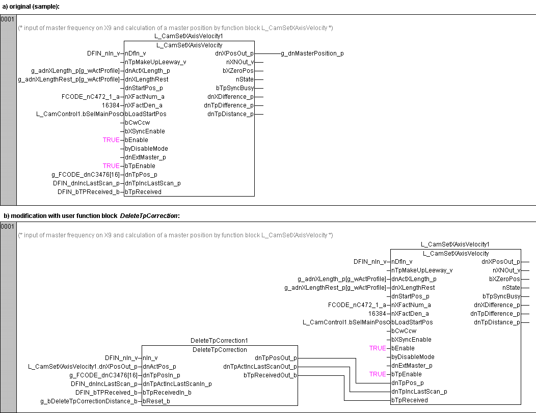 Beschalten Sie das Touch-Probe-Interface des Funktionsblocks L_CamSetXAxisVelocity wie unten dargestellt mit dem Anwender-Funktionsblock DeleteTpCorrection.