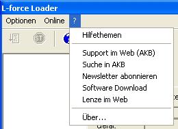 Das Menü ? (Hilfe) im L-force Loader enthält mehrere Links auf die Lenze Application Knowledge Base (AKB) der Lenze-Homepage.