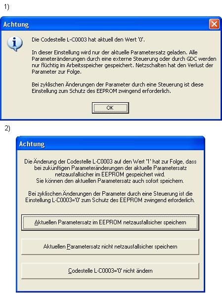 Das zweite Fenster (2) unterstützt den Anwender bei der Änderung der Codestelle C0003 von 0 auf 1.