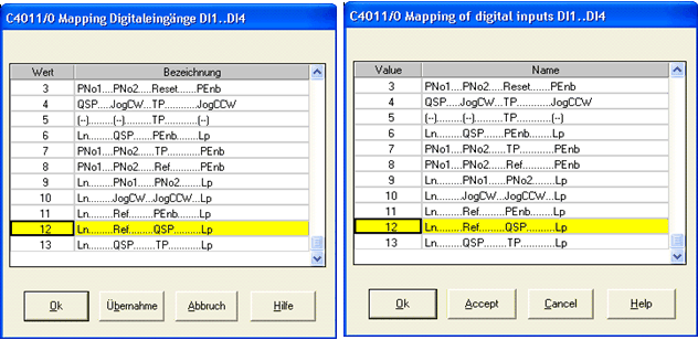 Die Auswahlmöglichkeiten für die Funktionszuordnung (Mapping) zu den digitalen Eingängen unter C4011 ist jetzt um zwei Kombinationen mit Quickstopp (QSP) erweitert worden: