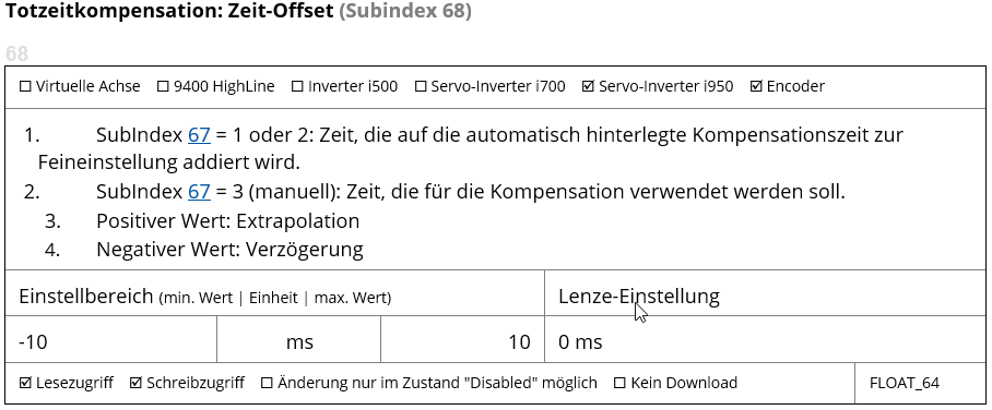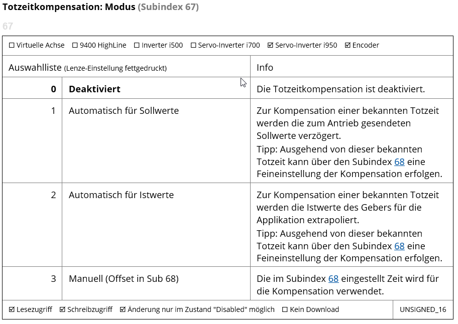 Die Totzeitkompensation kann im Subindex 67 aktiviert werden.