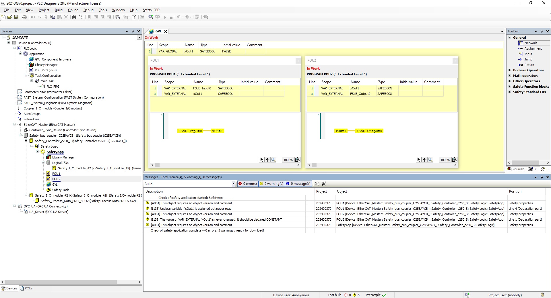 Sollen zwischen mehreren Safety-Extended-POUs Daten ausgetauscht werden, erfolgt dies über eine Safety-GVL (global variable list). Beim Kompilieren der SafetyApp treten unerwartete Warnungen auf, die auf nicht-existierende Ungereimtheiten im Programm hinweisen.