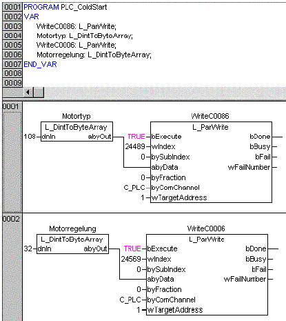 In der System POE 'PLC_ColdStart' muss eine Initialisierung der entsprechenden Codestellen vorgenommen werden. In dem unten gezeigten Beispiel einer Initialisierung wird die Codestelle C0086 mit dem Motortyp beschrieben und die Codestelle C0006 mit der Art der Motorregelung.