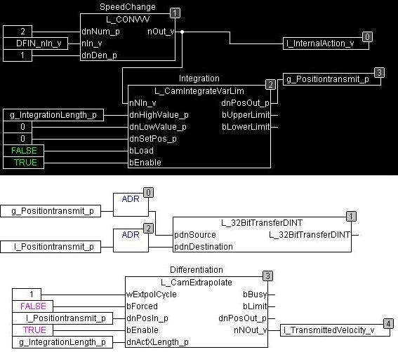 Muss ein _v-Signal über eine Taskgrenze hinweg übertragen werden, so ist zunächst zu entscheiden, ob das Signal nur als Drehzahlwert übertragen werden kann, oder ob ein inkrementgenauer Positionsbezug notwendig ist. Im ersten Fall kann das Signal direkt übergeben werden. Ist eine inkrementgenaue Übertragung notwendig, so ist das Signal zunächst zu integrieren. Dabei sollte eine Integration mit begrenztem Positionsbereich durchgeführt werden. Das integrierte Signal wird dann gemäß wie unter 20031727 beschrieben auf die andere Task übertragen und dort mittels eines Differenzierers in das entsprechende Geschwindigkeitssignal (*_v) zurückgewandelt.