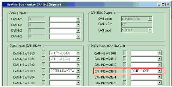Für die verschiedenen Feldbus-Funktionsmodule Systembus CAN stehen Monitordialoge für die Prozessdateneingänge zur Verfügung, die den Status und die Verknüpfung anzeigen. Wird eine Verknüpfung des Signals CAN-IN2-W2-Bit2 parametriert, wird diese im Systembusmonitor CAN-IN2 einwandfrei angezeigt.