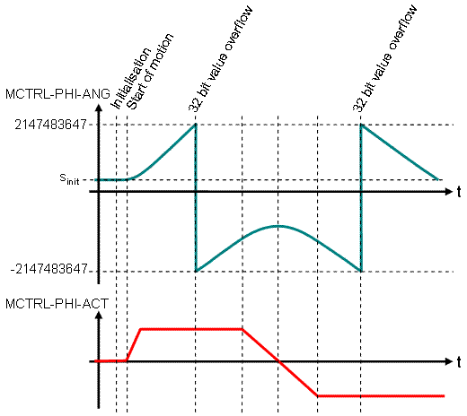 Ein Beispieldiagramm ist unten gezeigt: Nach der Initialisierung hat MCTRL-PHI-ANG einen Anfangswert von Sinit. Von diesem Wert aus nimmt MCTRL-PHI-ANG alle Werte zwischen - 2.147.483.647 und + 2.147.483.647 [Inkremente] abhängig von dem Bewegungsprofil des Antriebs an.