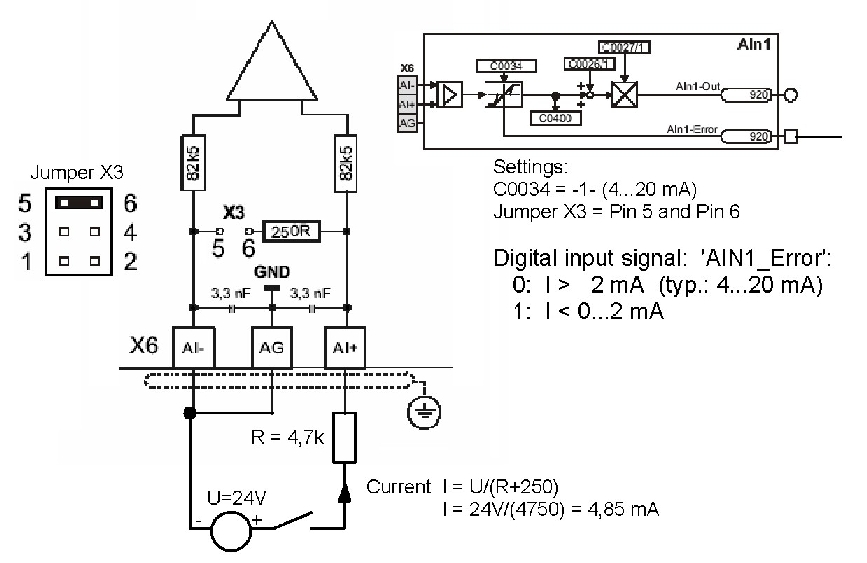 Die Störungsreaktion SD5 muss, wie in default-Einstellung, ausgeschaltet bleiben: Codestelle C0598 = 3 (Off). Trotzdem schaltet das digitale Monitorsignal 'AIN1-Error', wenn ein Drahtbruch erkannt wird.