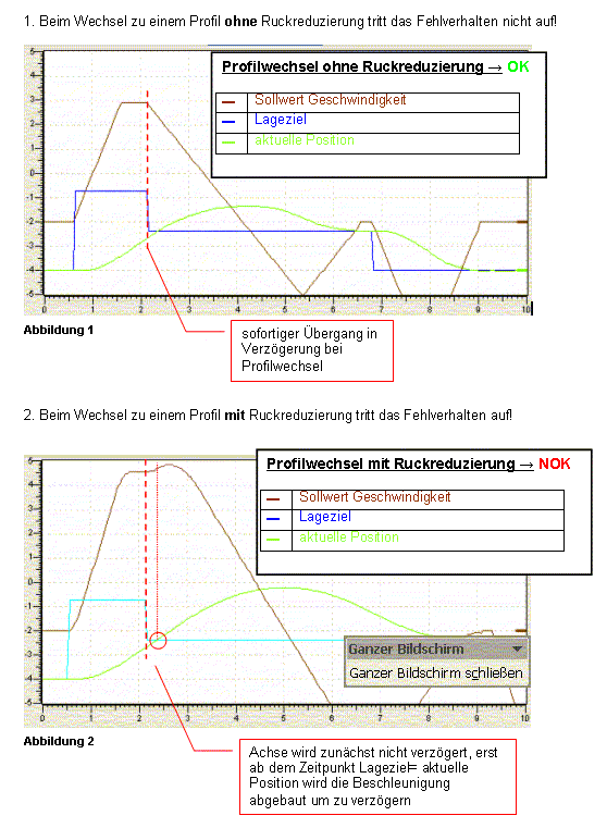 Wenn für das Folgeprofil die Ruckreduzierung deaktiviert wird (Jerk time = 0), dann kommt es nicht zu dem verspäteten Einsetzen der Verzögerung.