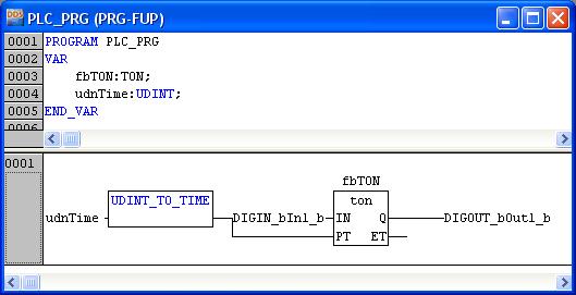 Um nun trotzdem einen Zeitwert über eine Codestelle eingeben bzw. anzeigen zu können, legt man eine Hilfsvariable mit einem der oben beschriebenen Datentypen (z. B. UDINT) an. Mit Hilfe einer Konvertierfunktion (z. B. UDINT_TO_TIME) kann der Wert der Variablen in den Datentyp TIME konvertiert werden. Der Datentyp TIME hat eine Datengröße von 32 Bit. Bei der Konvertierung entspricht der Wert 1 dem Zeitwert 1 Millisekunde.