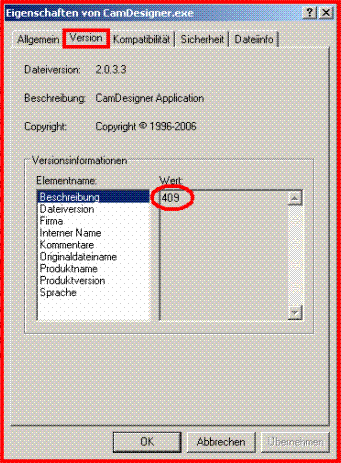 2. Ermitteln Sie über den Menüpunkt Eigenschaften des Kontextmenüs (rechter Mausklick auf die Datei CamDesigner.exe) die Windows-Versionsnummer der Datei CamDesigner.exe.