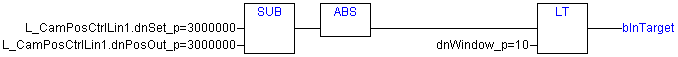 Betreiben Sie den Funktionsblock nur im absoluten Positioniermodus (L_CamPosCtrlLin.bPosMode = FALSE). Verwenden Sie außerdem das Statusbit L_CamPosCtrlLin.bInTarget nicht. Generieren Sie die Meldung 'in target' alternativ über unten dargestellte FB-Verschaltung. Der zweite Eingang an der LT-Funktion stellt ein Fenster dar. Befindet sich die aktuelle Position innerhalb des Fensters um die gewünschte Zielposition, wird die Meldung 'in target' gesetzt