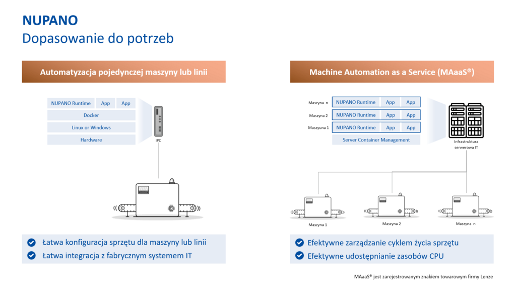 Werner Paulin: Oczywiście rozwój w firmie Lenze nigdy się nie kończy. Obecnie koncentrujemy się na rozszerzeniu naszej sieci partnerów. Z jednej strony chcemy oferować aplikacje, które są powszechnie dostępne dla wszystkich. Z drugiej strony rozszerzamy sieć o firmy technologiczne, które rozwijają w Nupano usługi IT na zamówienie. Chcemy również rozwijać naszą koncepcję MAaaS® (Machine Automation as a Service). Połączenie maszynowego IT z infrastrukturą serwerową oferuje zaletę w postaci ogromnie zwiększonej dostępności maszyn.