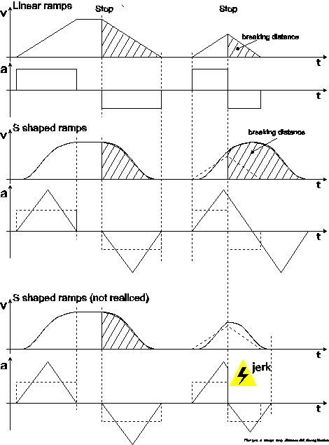 • If S-ramps are to achieve the same positioning time as linear ramps the peak acceleration must have the twice the value of the linear profile (see diagram).