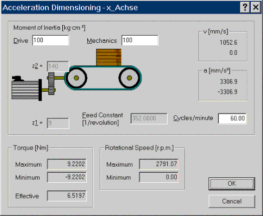 An extensively correct drive selection is not possible when using the Cam Designer Professional 2.2 since not all motor loads (active loads, static friction, dynamic friction, ...) are considered in this dialog. It is only possible to consider torques resulting from acceleration/deceleration (dynamics).